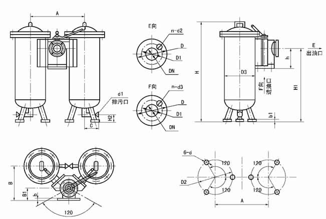 1、過濾器分別由兩組過濾裝置和一個六通換向閥組成,正常工作時,一組過濾裝置投入運行,另一組被換向閥封閉備用。