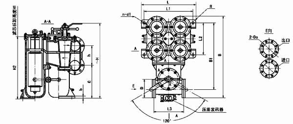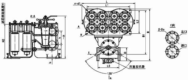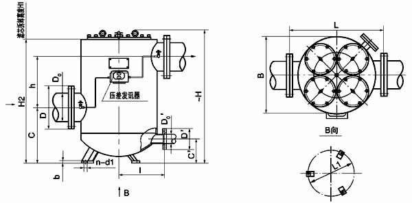 法蘭標(biāo)準(zhǔn):GB573-65(可根據(jù)需要確定):DN100、150-3 組濾芯組件 DN200-4 組濾芯組件;壓差發(fā)訊器為選配件。