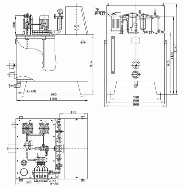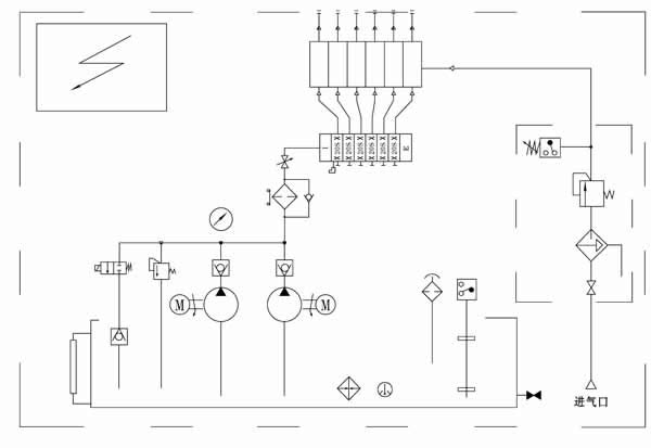 該站主要由油箱(帶電加熱器、液位計(jì)、電接點(diǎn)溫度計(jì)、空氣濾清器、液位控制器)、兩臺高壓油泵裝置(一備一用)、溢流閥、二位二通電磁閥、過濾器、單向閥、壓力表、KM型遞進(jìn)式分配器、油氣混合器、壓力控制器及氣動三聯(lián)件和PLC電氣控制箱等組成。
